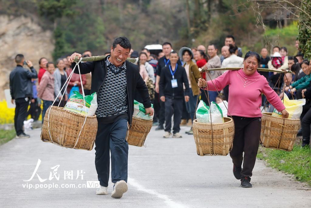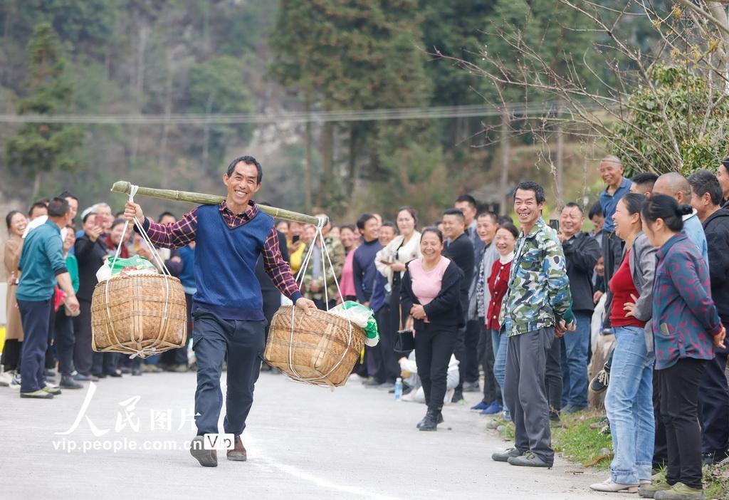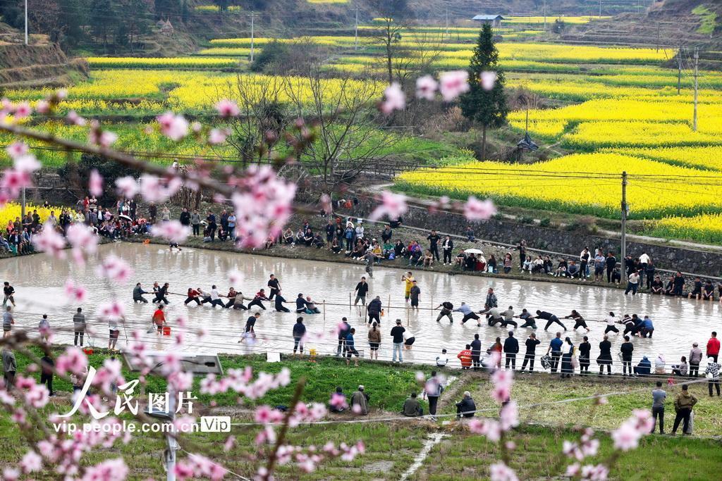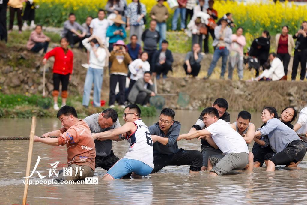 2025年3月22日,贵州省黔东南苗族侗族自治州施秉县马溪乡举办一场别开生面的“田运会”,田间拔河、稻田捕鱼、扁担挑粮接力赛等田间趣味活动精彩纷呈,游客和村民参加各项活动,欢声笑语不断。磨桂宾摄(人民图片网)